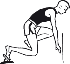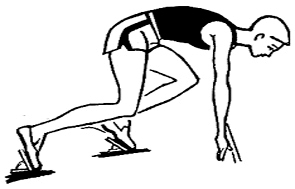 - колено стоящей сзади ноги отрывается от грунта; таз приподнимается выше плеч; коленный сустав передней ноги образует почти прямой угол; спина слегка приподнята; голова опущена, как при команде «На старт!»; тяжесть тела перенесена на руки.