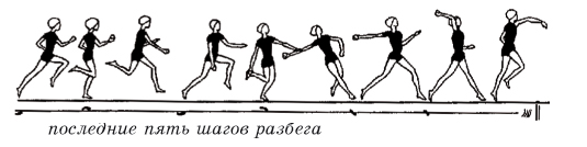 - разбег выполняется строго по прямой линии с 10–12 м (длина разбега строго индивидуальна); разбег выполняется с ускорением, но следует помнить, что слишком большая скорость затрудняет правильное выполнение броска.