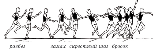 - в конце разбега разогнуть руку и выполнить замах назад; одновременно поворачивать туловище направо; затем выполняется «скрестный шаг», т. е. выполняется шаг правой ногой носком кнаружи, с поворотом таза в ту же сторону; этот шаг выполняется значительно быстрее других, чтобы обогнать туловище.
