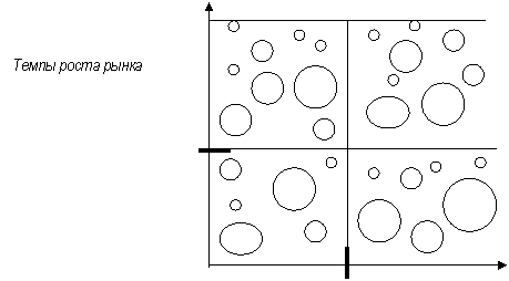 Темпы роста рынка откладываются по осе ординат, а относительная доля рынка – по осе абсцисс. (см. рис. 1). На этом же рисунке каждое структурное подразделение изображено в виде кружочка с определенным диаметром. Размер этого диаметра соответствует вкладу подразделения в доход предприятия, выраженному в процентах.