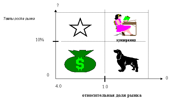 Вертикальная разделительная линия, а точнее граница между «высокой» и «низкой» относительными долями рынка по стандартам БКГ должна проходить через критическую точку на оси абсцисс 1.0.(см. рис.8). Структурные подразделения, оказавшиеся левее вертикальной границы, относятся к отраслевым лидерам и потому способны диктовать «моду» в области затрат и цен, а, следовательно, генерировать высокие денежные потоки. Структурные подразделения, оказавшиеся по правую сторону от границы отстают от лидера, вынужденные следовать в их форватере.