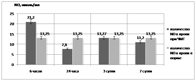 5. При тяжелой черепно-мозговой травме, существует 2 временных промежутка, в течение которых происходит выброс NО в кровеносное русло: в первые часы и на 3 сутки после травмы, когда уровень метаболитов NO в крови повышается в 1,5 раза по сравнению с нормальными величинами.