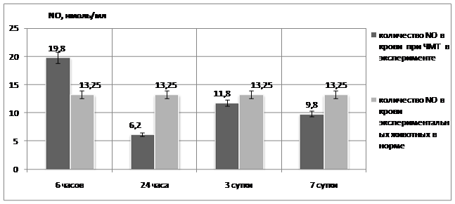 При исследовании уровня оксида азота в крови отмечалась сходная динамика NO в плазме крови, как в эксперименте, так и в клиническом течении ЧМТ. Сразу после травмы наблюдалось увеличение уровня оксида азота в крови. Средние величины NO были самыми высокими в первые часы и за 7-дневный контрольный период возвращались к нормальным. Отмечалось резкое падение количества NO в крови к концу первых суток. К 3 суткам уровень NO в крови находился уже в пределах нормальных величин. Через 7 суток течения травматической болезни головного мозга значения NO в крови экспериментальных животных и человека не выходили за пределы референсных значений (рис. 1, 2).