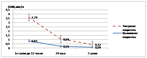 При исследовании уровня белка S-100 в крови пациентов с тяжелой черепно-мозговой травмой были получены следующие результаты. В первые часы после травмы отмечалась достоверная разница между уровнями белка S-100 в группах выживших и умерших пациентов. Уровень белка в группе умерших пациентов в этот временной промежуток был в 3,3 раза выше, чем в группе выживших (рис. 3). У всех выживших пациентов имело место достоверное снижение уровня белка S – 100 к 24 часам в среднем на 75% с последующим более плавным снижением вплоть до нормализации к 7 суткам. В группе умерших пациентов к концу первых суток снижение носило недостоверный характер. На 7 сутки уровень S-100 был в группе пациентов с летальным исходом в 3,2 раза выше нормы.
