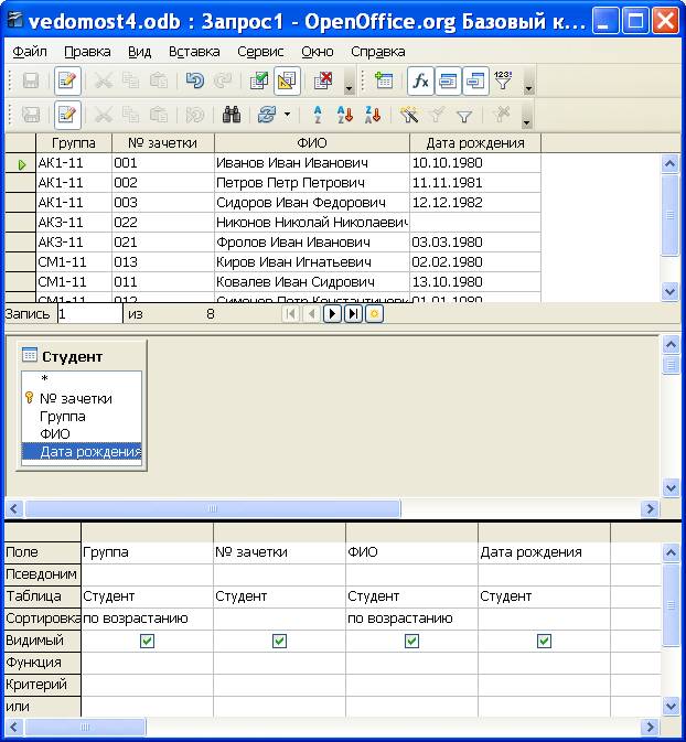 SELECT "Группа", "ФИО", "№ зачетки", "Дата рождения" FROM "Студент" ORDER BY "Группа", "ФИО" | Выбираемые записи сортируются сначала по шифру группы, затем по ФИО (по возрастанию). |