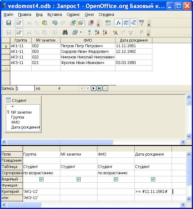 Получили студентов из группы 'АК1-11' с датой рождения >= #11.11.1981# а так же всех студентов группы 'АК3-11'. Как понять, что получится в результате запроса?