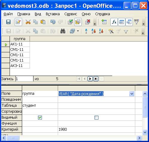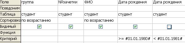 Создайте новый запрос в режиме дизайна. Добавьте таблицу «Студент». Добавьте колонки «Группа» и «Дата рождения». Во второй колонке организуйте вычисление выражения «YEAR("Дата рождения")», задайте критерий отбора 1980, снимите отметку «Видимый».