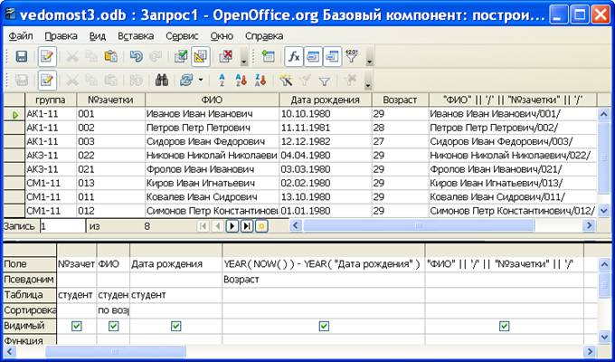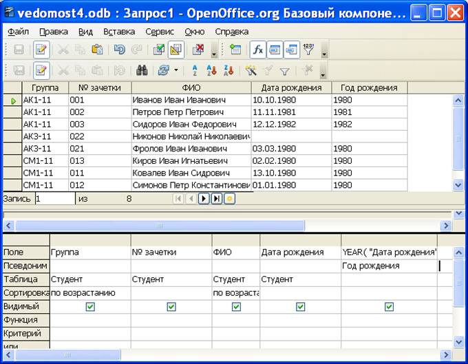 К значениям полей можно применять различные функции, например, если мы хотим получить год рождения каждого студента, надо ввести вместо имени поля выражение: