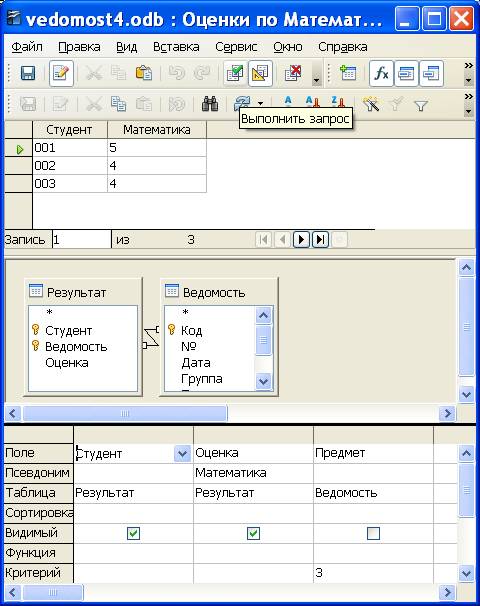 Создаем новый запрос в режиме дизайна. Добавляем таблицы «Результат» и «Ведомость». Добавляем колонки «Студент» и «Оценка» из таблицы «Результат». Добавляем колонку «Предмет» из таблицы «Ведомость». Колонке «Оценка» даем псевдоним «Математика». Для колонки «Предмет» задаем критерий отбора равный коду математики (Посмотрите в таблице «Предмет»). Значения в колонке «Предмет» все одинаковые их мы и так знаем, поэтому, снимем отметку «Видимый».