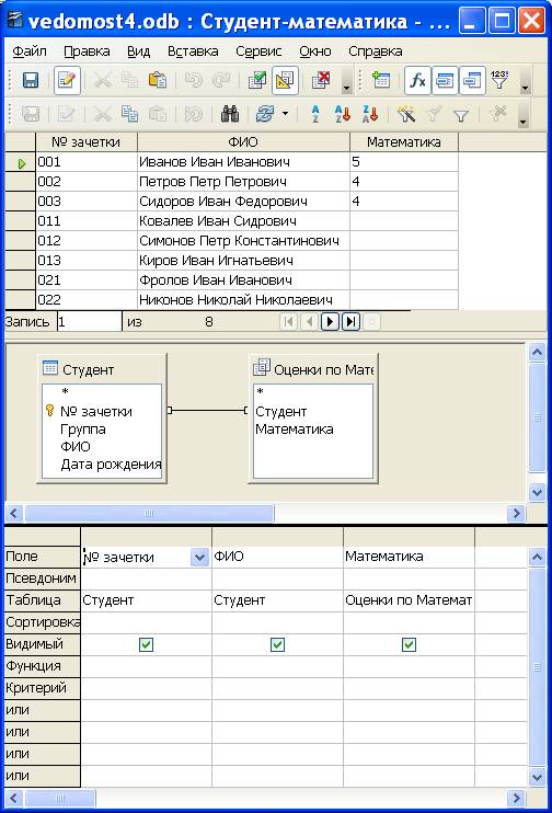 Сохраните полученный запрос под именем «студент - математика» и снимите с него копию (Ctrl+C, Ctrl+V в главном окне программы). Поэкспериментируем с ним.