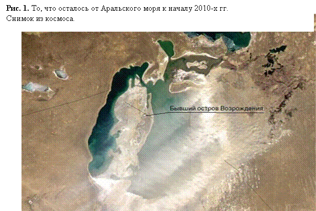 К настоящему времени Аральское море практически полностью исчезло (см. рис. 1) в результате хозяйственной деятельности человека, ориентированной руководством СССР на достижение чисто экономических результатов. Но после краха СССР эстафету приняло руководство приаральских государств. В результате деградации и практически полного исчезновения Аральского моря изменились природная среда и климат прилегающих регионов нескольких государств.