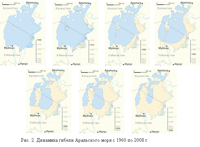 По данным [[86]] конфигурация береговой линии Аральского моря с 1960 по 2008 г. изменялась следующим образом (см. рис. 2).