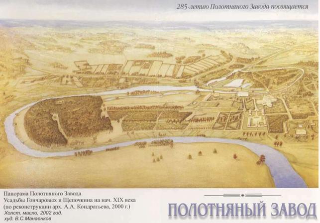 Прямоугольнички, тянущиеся полосой вдоль реки в верхней части рисунка, — усадьбы собственности Гончаровых: крепостных рабочих полотняного завода и бумагоделательной фабрики.