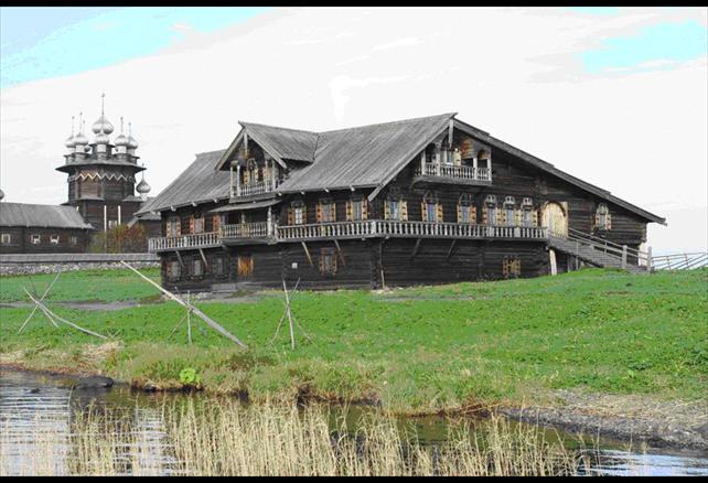 В качестве примера выше приведена фотография дома, сохраняемого в архитектурном заповеднике Кижи (дом перенесён из деревни Ошевнево, где он был построен в 1876 для большой семьи крестьянина Нестора Максимовича Ошевнева).