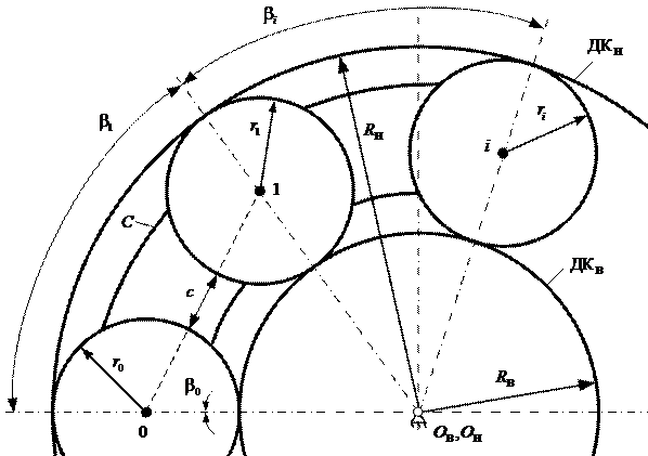 – дорожки качения внутреннего и наружного колец; RВ, RН, ОВ и OН – радиусы и геометрические центры дорожек качения внутреннего и наружного колец; С – сепаратор (водило);