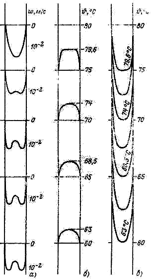 Рис. 3-12. Распределения скоростей (а), температур (б) и положения изотерм (в) масла в работающем радиаторе.