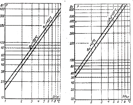 Рис. 3-14. Зависимость теплового потока P секции радиатора от перепада температуры между маслом и стенкой радиатора | Рис. 3-14. Зависимость теплового потока P секции радиатора от перепада температуры между маслом и стенкой радиатора |