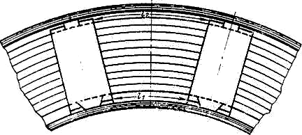 Примерно 35% горизонтальной поверхности катушек закрыто прокладками и 20% вертикальной поверхности - рейками. Ширина вертикальных каналов, число которых совпадает с числом столбов прокладок, принимается равной длине дуги между прокладками и обозначается