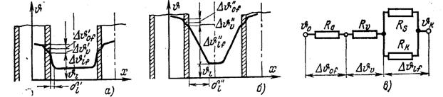 Рис. 3-21. Перепады температур в воздушном канале между двумя секциями и в масле у стенки радиатора при конденсаторном распределении температуры (а - внизу на входе в радиатор; б – вверху на выходе из радиатора; в - тепловая схема замещения).