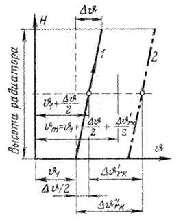 Рис. 3-24. К расчету теплоотдачи радиатора. 1 - температура нагревающегося воздуха; 2 - температура стенки радиатора.