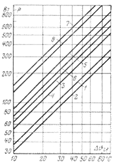 Рис. 3-35. Зависимость теплового потока Р от перепада температуры между стенкой радиатора и воздухом