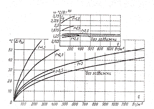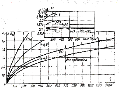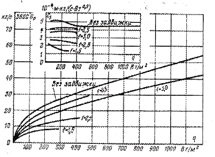 . Кривые построены для следующих семи значений q: 73,8; 163; 227; 377; 638; 1020; 1245 Вт/м2.