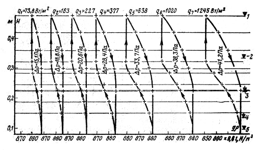 Режим течения масла в масляных каналах радиатора - ламинарный. Как уже было показано, круговое движение масла поддерживается той разностью давлений, которая возникает в связи с изменением удельного веса благодаря теплообмену между частицами масла и равна площади петли давления на диаграмме распределения удельных весов. В этом случае движение масла можно рассматривать как принудительное движение и поэтому можно воспользоваться известным по [9] критериальным уравнением