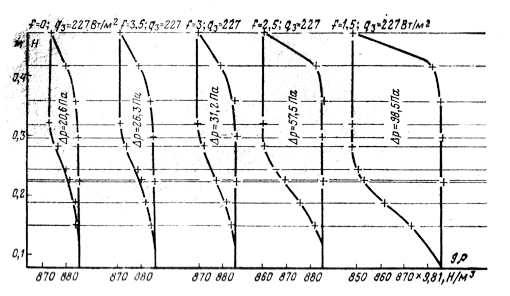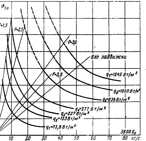 , полученные на основании экспериментов. Из этих кривых видно, что каждому положению задвижки f и значению поверхностной плотности теплового потока q соответствует одна рабочая точка. Рабочая точка является точкой пересечения кривых, построенных при