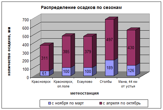 Осадки: распределение осадков по территории района неравномерно, в лесостепной зоне годовое количество осадков – 3мм, в горных районах – 556–686 мм. Распределение осадков в течение года по всей территории имеет закономерность: в теплый период, с апреля по октябрь, выпадает 80-84%, в холодный период, с ноября по март, лишь 16-20%.