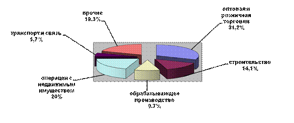 Вторым по удельному весу в структуре по экономической деятельности следуют организации, занимающиеся операциями с недвижимым имуществом, арендой и предоставлением услуг - 20 %, строительные организации – 14,1 %, предприятия обрабатывающего производства – 9,7 %, транспорт и связь 5,7 % (рис. 14).