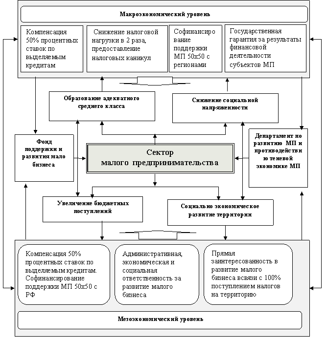 Для повышения эффективности деятельности субъектов МП в официальном секторе экономики предполагается введение принципа прямой заинтересованности регионов в их деятельности, что предусматривает следующее: все налоговые поступления от деятельности всех субъектов малого бизнеса остаются на территории, где зарегистрирован субъект МП; финансовая поддержка деятельности субъектов МП предусматривает софинансирование региона и федерации в пропорциях 50 на 50, т. е. при выделении регионом сектору МП финансовых средств происходит увеличение выделенной суммы в два раза за счет федеральных средств; получении субъектами малого бизнеса кредитов, компенсация процентов по выделенным кредитным ресурсам происходит за счет регионального и федерального бюджетов (фондов) на паритетных началах – 50 на 50. Без активного воздействия государства на формирование и развитие предпринимательской деятельности в секторе малого бизнеса, ее становление не может быть достаточно гармоничным и эффективным. Стихийное развитие предпринимательства приводит к значительным диспропорциям в экономике страны, сама предпринимательская деятельность субъектов МП серьезно деформируется, в частности концентрируется в теневом секторе экономики, вместо того, чтобы развиваться в официальном секторе экономики. Для устойчивого эффективного развития сектора МП на здоровой экономической основе оно должно постоянно подвергаться разумному воздействию государства, его регулированию и поддержке, которое возможно только в том случае, если само воздействие государства на предпринимательство будет формироваться и развиваться рациональным образом. Для обеспечения этого на практике необходимы фундаментальные и прикладные научные исследования в области формирования и развития государственного регулирования деятельности субъектов малого бизнеса, поддержки сектора малого предпринимательства и противодействия их теневой деятельности.