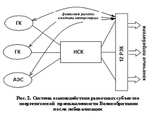 В результате проведения начальных преобразований в электроэнергетике Англии и Уэльса субъектами рынка стали, как частные компании (две частные генерирующие энергокомпании – ГЭК, в состав которых входят ТЭЦ на органическом топливе; 12 частных районных электроэнергетических компаний – РЭК, обеспечивающих эксплуатацию распределительных сетей напряжением 138 кВ и ниже и поставку электроэнергии потребителям на среднем и низком напряжениях), так и государственные (одна государственная энергокомпания АЭС; национальная сетевая компания – НСК, в состав которой входят основные электрические сети напряжением 275 и 400 кВ, национальный и региональные деспетчерские центры). Схематически система взаимодействия этих рыночных субъектов выглядит, как это показано на рис. 2.