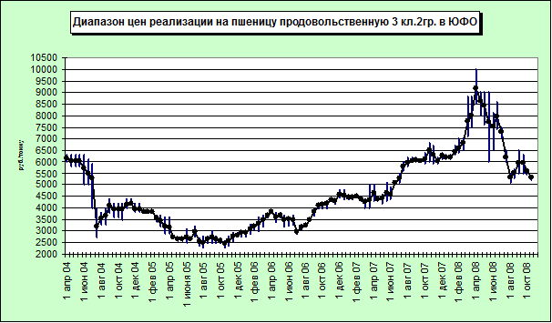 Цена реализации, по состоянию на 15.10.08 формировалась по тому же сценарию ценового развития, что и пшеница продовольственная 3 класса. В Краснодарском крае цены претерпела 13% снижение и составила 4000 руб./тонну. В Волгоградской области и Ставропольском крае снижение не превышало 9%, реализация осуществлялась в обоих регионах по цене 3800 руб./тонну. В Ростовской области снижение так же оказалось значительным 8,8% составило падение, но цена остаётся самой высокой по округу 4500 руб./тонну.