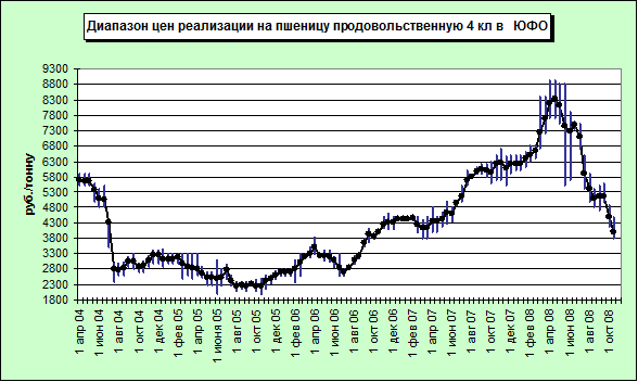 Закупочные цены на пшеницу продовольственную 4 класса, по состоянию на 27.10.08 отличались большей выравненностью ценовых диапазонов, что обусловлено, вероятно, более однородными характеристиками зерна и большей долей в валовом сборе. В большинстве регионов спрос был сформирован в рамках 3500 – 4000 руб./тонну. Кроме Ростовской области, где, не смотря на самый высокий уровень цен, диапазон сформирован в довольно широком ценовом коридоре 3700 – 4700 руб./тонну.