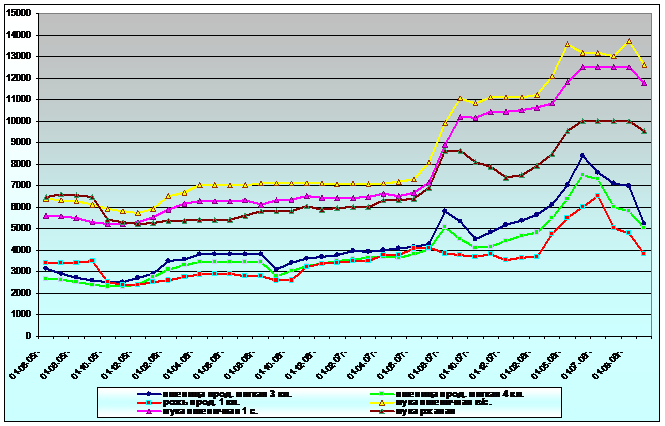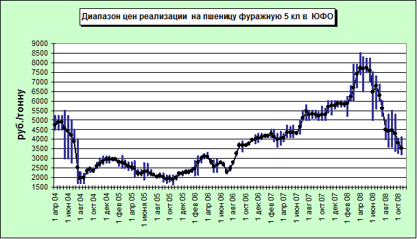 Закупочные цены на пшеницу фуражную 5 класса по состоянию на 27.10.08 в меньшей степени, чем продовольственное зерно подвергалось ценовой коррекции. Что с большой долей вероятности обусловлено закупками в интервенционный фонд, где объём пшеницы 5 класса составляет около 50% совокупных закупок в интервенционный фонд или тонн по средней цене 4 067 руб./тонну. В регионах Краснодарского края и Ставропольского края спрос обозначен в пределах 3100 – 3500 руб./тонну. В Волгоградской области объём фуражной пшеницы остаётся «весомым» фактором давления на цены диапазон закупок обозначен 2800 – 3000 руб./тонну. В Ростовской области цена спроса порой достигала уровня продовольственной пшеницы 4 класса до 4600 руб./ тонну, однако большинство предложений по закупкам были в диапазоне 3000 – 4200 руб./тонну.