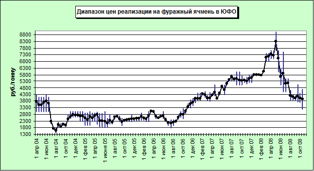Закупочные цены на ячмень фуражный по состоянию на 27.10.08 в большинстве своём демонстрировали единство ценовой политики с пшеницей фуражной 5 класса. Так от 3000 до 3500 руб./тонну можно было продать фуражный ячмень в регионах Краснодарского и Ставропольского края. Начиная от 2800 рублей и до 3000 рублей за тонну включительно, закупали ячмень в Волгоградской области. Свыше 3600 и до 4500 рублей был обозначен спрос в Ростовской области.