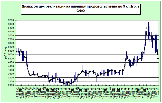 В Красноярском крае стоимость пшеницы 3 класса варьировалась в диапазоне руб./т, но в основном не превышала 5000 руб./т.