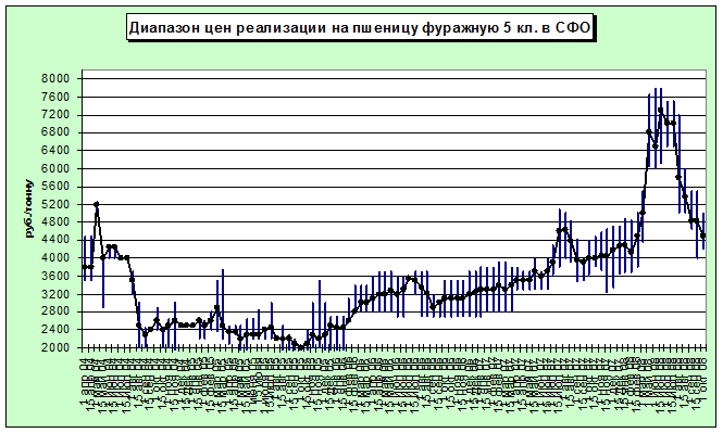 По информации из Красноярского края, закупочные цены на фуражную пшеницу варьировались в диапазоне руб./т., но в основном не превышала отметки в 4500 руб./т.