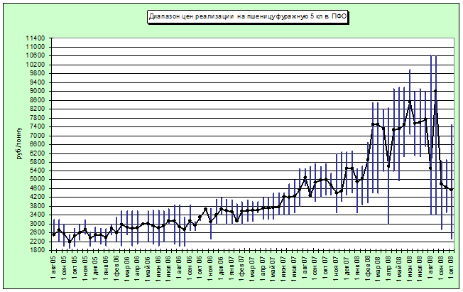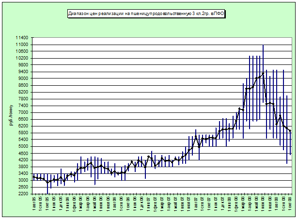 Диапазон цен на основной экспортируемый товар (около 80% от всего российского зернового экспорта) – пшеницу 4 класса составляет в настоящее время от 150 долл. США за тонну в Ростовской области до 200 долл. США за тонну в г. Новороссийск и Туапсе на условиях FOB.