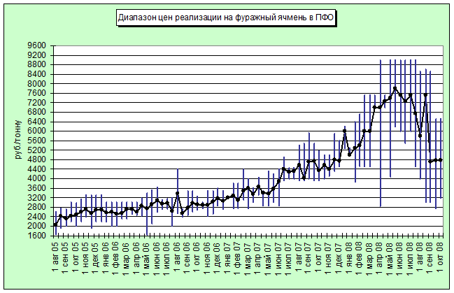 Слабое снижение, в пределах 3 – 4% наблюдалось в регионах Саратовской и Нижегородской областей, а также Республике Мордовия. Цены составили соответственно 4840; 6400 и 5000 руб./тонну зерна. В регионах Пермской области и Республике Марий Эл цены остаются неизменными, соответственно 6100 и 7500 руб./тонну. И только в регионах Республики Татарстан и Оренбургской области отмечалось падение цен на, соответственно 8,3% и 7,1%, цены снизились до уровня 5500 и 5850 руб./тонну, что составляет средний уровень цен в Приволжском ФО.