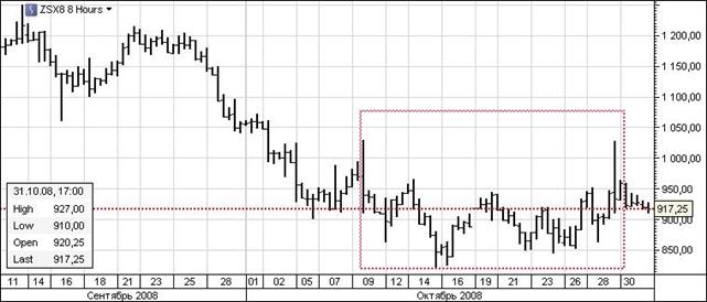 Рис. 1 На графике цены фьючерса на сою поставкой в декабре 2008 года на чикагской бирже период между объявлением прогноза и его коррекцией выделен прямоугольником. Отчётливо видно, как первоначальное падение усиливается после объявления прогноза валового сбора сои и сменяется ростом после его коррекции в сторону понижения.