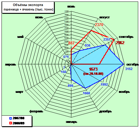 Настроения участников российского зернового рынка далеки от радужных. Наряду с фундаментальным фактором давления на рынок рекордного валового сбора, порядка 110,5 млн. тонн, ключевое влияние как на зерновой рынок в частности, так и на российскую экономику в целом оказывает развал мировой финансово – валютной системы. Так для потребительского сектора мировой финансовый кризис ведёт к дефициту торгового баланса, в результате часть операторов, главным образом экспортёры, использующие заёмные средства, покинули рынок. По данным ФТС России по состоянию на 21.10.08 объёмы экспорта с начала сезона превышают прошлогодний показатель на 12,4%, за счёт рекордных отгрузок в августе – сентябре. Однако негативные ожидания снижения экспортного спроса на зерно, обусловило резкое падение цен на все товарные позиции зерна на внутреннем рынке.