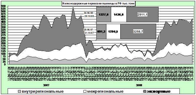 По данным СКЖД по состоянию на 20.10.08, объём перевозок пшеницы с начала сезона относительно прошлогоднего показателя увеличился на 4%, при этом отмечается увеличение доли внутри региональных перевозок и снижение экспортных в совокупном товаропотоке. Что говорит о том, что внутренний спрос пока способен компенсировать снижение экспортных отгрузок.