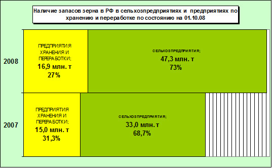 Однако, при текущих объёмах собранного урожая, сохранить стимул к дальнейшему воспроизводству сельскохозяйственной продукции возможно лишь при условии грамотного и своевременного государственного вмешательства. По данным Росстата на 01.10.2008 совокупные запасы зерна в РФ составляют 64,2 млн. тонн, что на 33,7% или 16,2 млн. тонн больше, сопоставимого периода прошлого года.