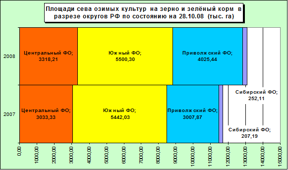 По данным Росстата, по состоянию на 28.10.08 сев озимых на зерно и зелёный корм был расширен относительно посевной площади прошлого года во всех ключевых зернопроизводящих округах РФ. Это служит позитивным сигналом, как для продовольственного сектора, так и для российской экономики в целом.
