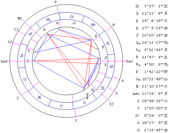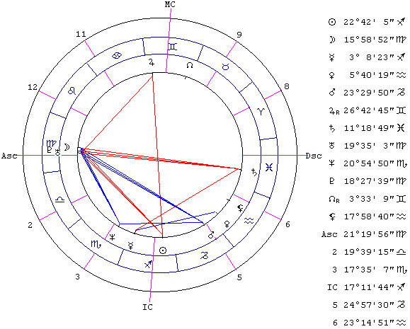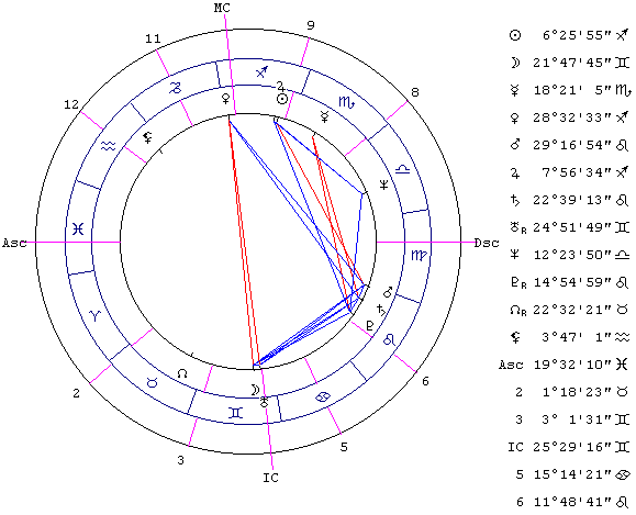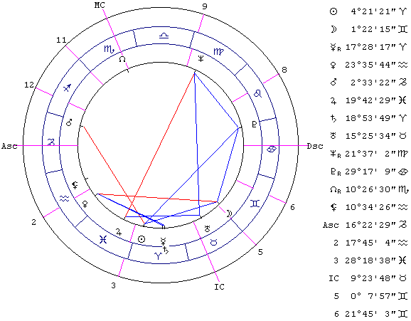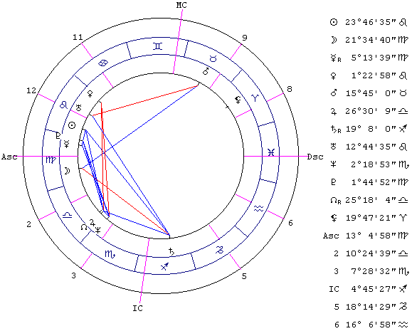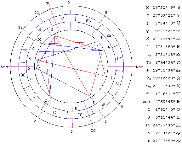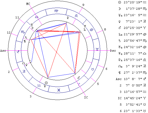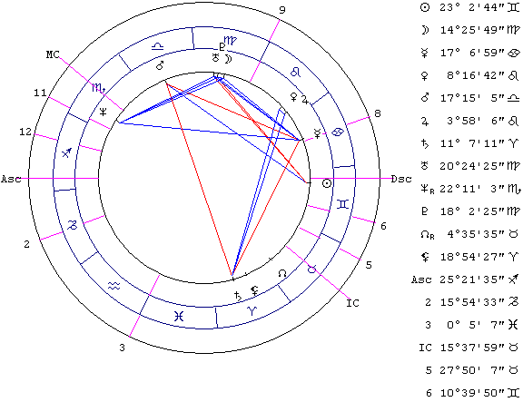 Здесь мы обнаружим все стандартные признаки врача, т. е. III+IV+IX+X+XII, и формулу болезни в купе с десятым домом - Меркурий (управитель шестого дома) в квадратуре с Плутоном в VIII доме, и этот Меркурий стоит в Х доме. Вот вам опять: нервы, голова, мозг, хирургия.