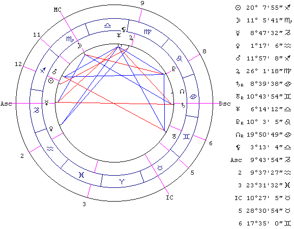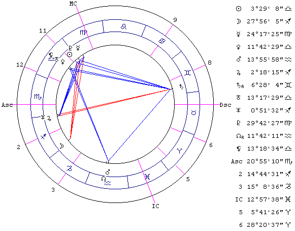 Оказывается важным влияние Сатурна. Юристы, конечно, не математики, но им необходима точность, точность формулировок, их ум должен быть точным, логичным и пунктуальным. В нашем примере Сатурн управляет III домом и в аспектах к Урану (соуправитель III дома) и Марсу (стоит в III доме).