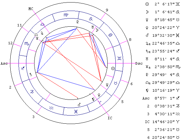 III-VI. Элементами III дома являются: Нептун и Плутон. Нептун в квадратуре с Меркурием (управитель VI дома) - раз. Нептун в квадратуре с Сатурном (стоит в VI доме) - два.