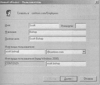 Имя входа пользователя (пред-Windows 2000) [User Logon Name) (Рrе-Windows 2000)] | Это имя используется для входа в систему с клиентов под управлением более ранних версий Windows, например Windows 9x/Me/NT 4 или Windows NT 3.51. Это поле является обязательным и должно быть уникальным в домене. |