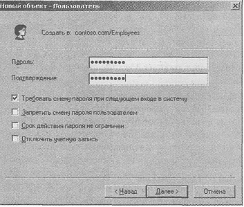 Закончив ввод значений, щелкните Далее (Next). На второй странице окна Новый объект — Пользователь (New Object—User) необходимо ввести пароль пользователя и установить управляющие флажки учетной записи (рисунок 2).